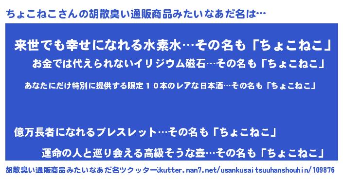 | 男性向けラノベタイトル風あだ名 | 『この素晴らしい世界にちょこねこを!』 |