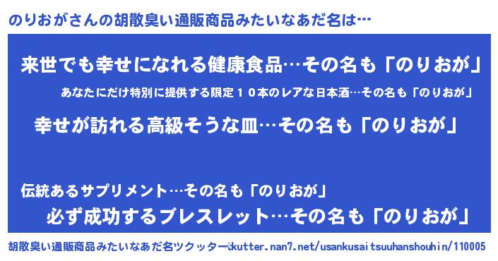 | 男性向けラノベタイトル風あだ名 | 『ノリオガスレイヤー』『のりおがの憂鬱』 |
