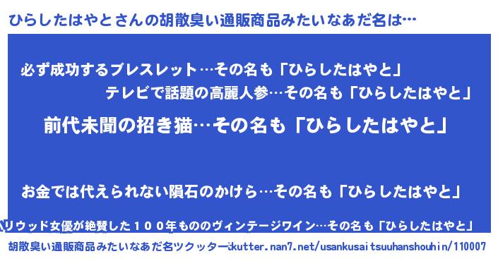 | ヘコむあだ名 | 『ひらしたはやと(笑)』『ひらふぇ~』 |