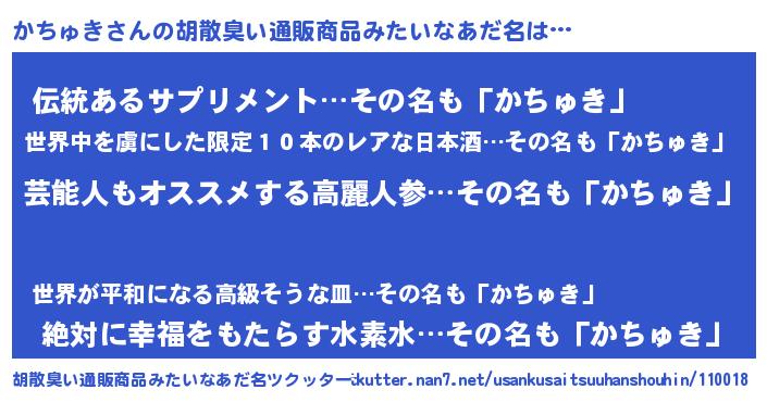 | 意味不明あだ名 | 『自称かちゅき』『なめこ科かちゅき属』 |