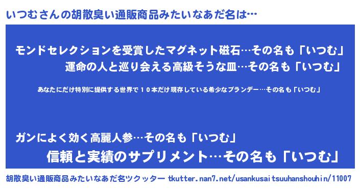 | ヒーロー風カッコイイあだ名 | 『仮面イツダー』『慈愛の使者いつむ』 |
