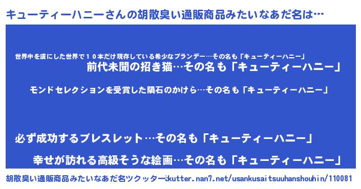| 男性向けラノベタイトル風あだ名 | 『キューティーハニーに滅ぼされるだけの簡単なお仕事です』 |