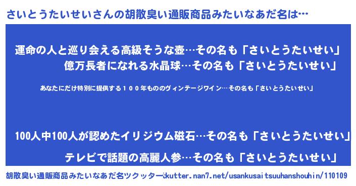 | 意味不明あだ名 | 『住所不定無職さいとうたいせい(13歳)』 |