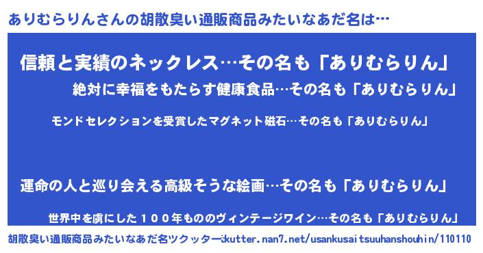 | ヘコむあだ名 | 『ありを』『ありむらりん(遠い目)』 |