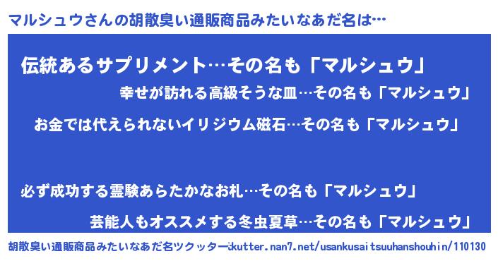 | 男性向けラノベタイトル風あだ名 | 『転生したらマルシュウだった件』 |