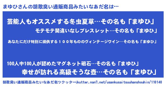 | 意味不明あだ名 | 『住所不定無職まゆひ(6歳)』『自称まゆひ』 |