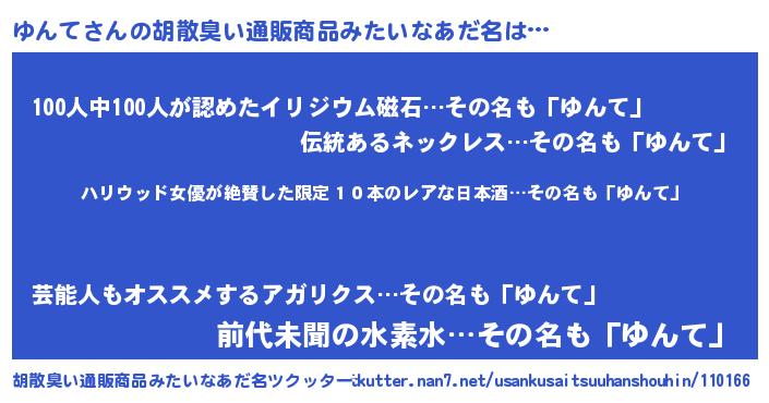 | 意味不明あだ名 | 『住所不定無職ゆんて(39歳)』『自称ゆんて』 |