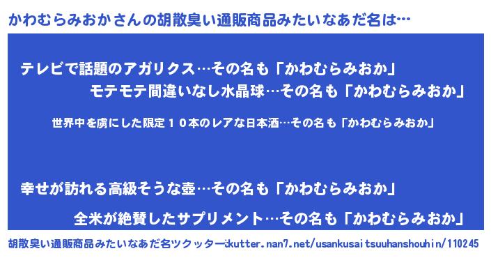 | 男性向けラノベタイトル風あだ名 | 『この素晴らしい世界にかわむらみおかを!』 |