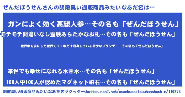 | 意味不明あだ名 | 『住所不定無職ぜんだほうせん(98歳)』 |