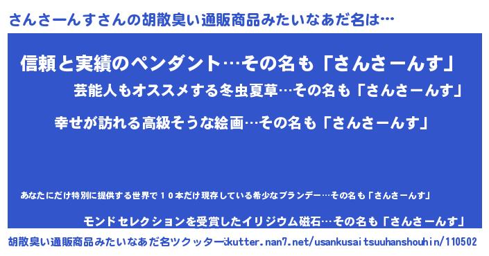 | 意味不明あだ名 | 『さんさーんすフォーエバー』 |