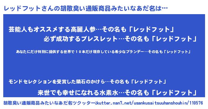 | 意味不明あだ名 | 『住所不定無職レッドフット(77歳)』 |
