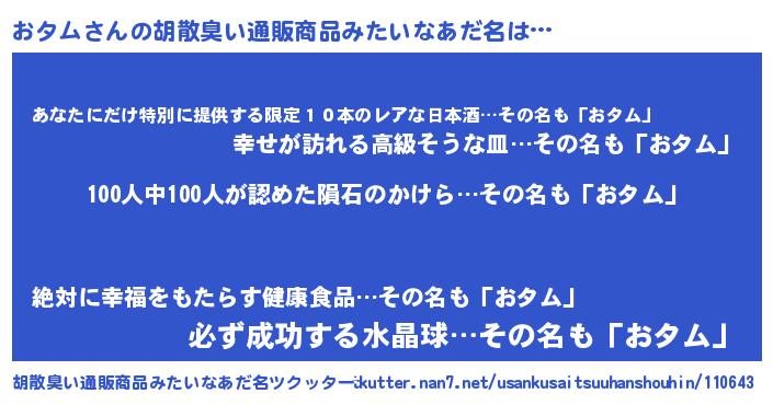 | ヒーロー風カッコイイあだ名 | 『正義の使者おタム』『仮面オタダー』 |