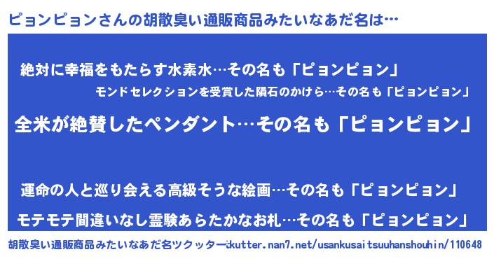 | 男性向けラノベタイトル風あだ名 | 『ピョンピョンの嫁は女の子じゃないと思った?』 |