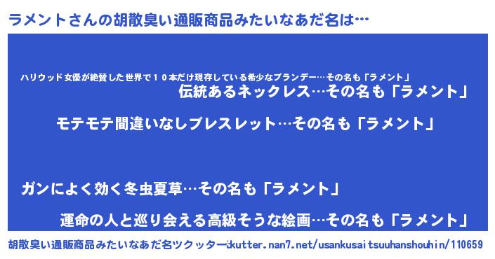 | 男性向けラノベタイトル風あだ名 | 『転生したらラメントだった件』 |