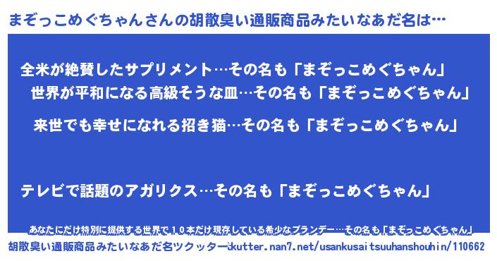 | ヘコむあだ名 | 『まぞっこめぐちゃん(笑)』『まぞっ子』 |