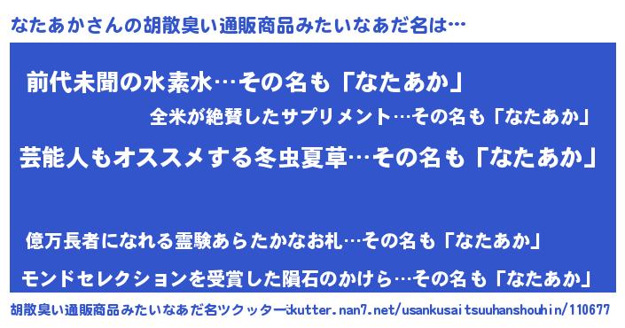| ヘコむあだ名 | 『なたあか(遠い目)』『なたぷりん』 |