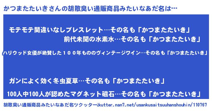 | ヘコむあだ名 | 『かつにー』『かつまたたいき(笑)』 |