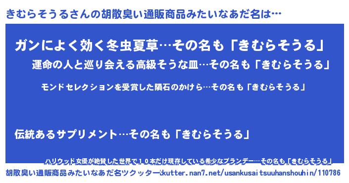 | 男性向けラノベタイトル風あだ名 | 『ノーゲーム・ノーキムラソウル』 |