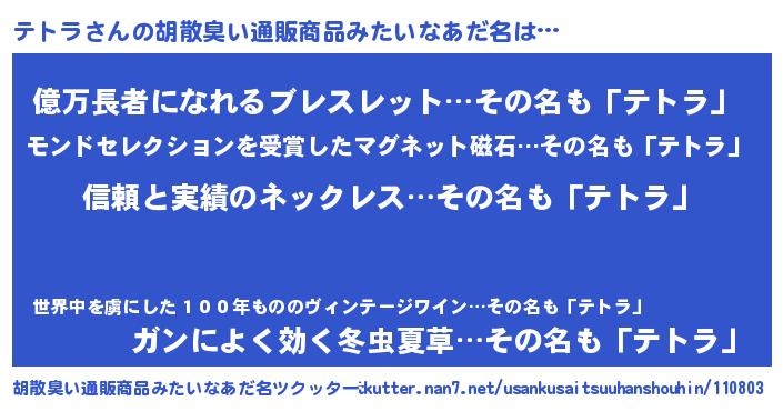 | 意味不明あだ名 | 『とにかく怪しいテトラ』『自称テトラ』 |