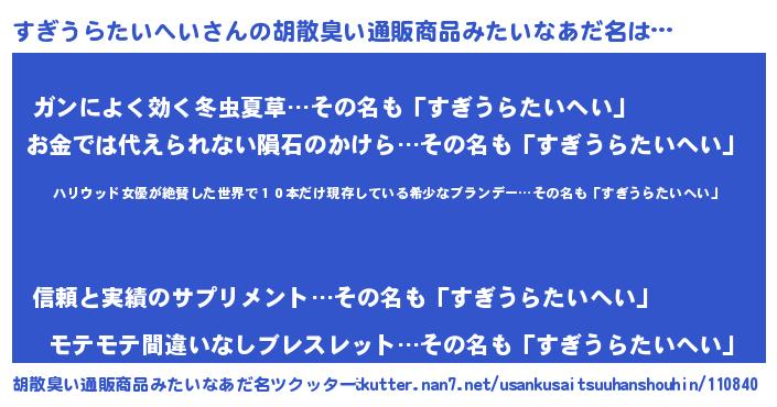 | 伝説のあだ名 | 『伝説のスナイパーすぎうらたいへい』 |