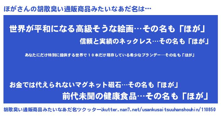 | 意味不明あだ名 | 『住所不定無職ほが(91歳)』『永久保存ほが』 |