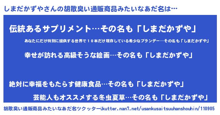 | 女子向けラノベタイトル風あだ名 | 『しまだかずやの雑貨屋さん』 |