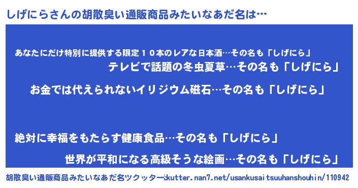 | 意味不明あだ名 | 『眠気覚ましガムしげにら味』 |