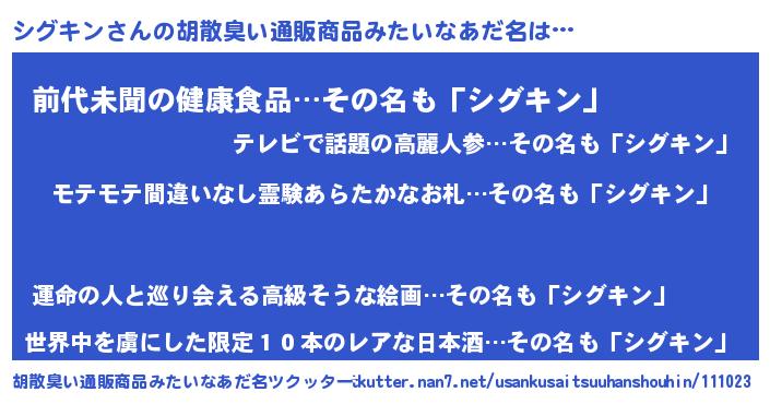 | 男性向けラノベタイトル風あだ名 | 『転生したらシグキンだった件』 |