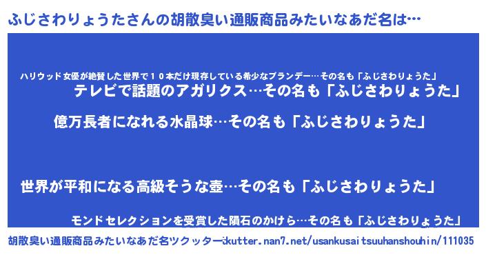 | 男性向けラノベタイトル風あだ名 | 『ふじさわりょうた~年齢イコール彼女いない歴の魔法使い~』 |