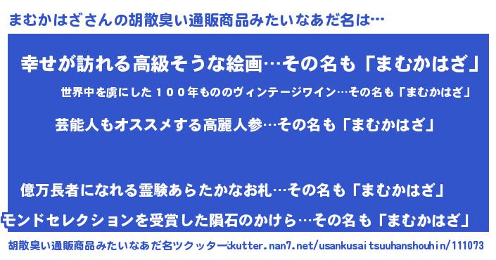 | 男性向けラノベタイトル風あだ名 | 『Re:まむかはざから始める異世界生活』 |