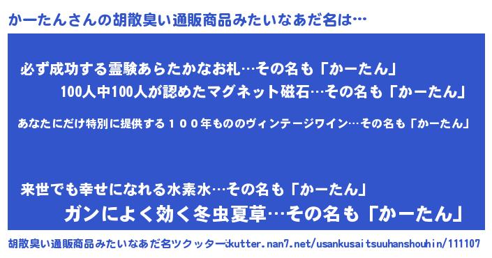 | 意味不明あだ名 | 『住所不定無職かーたん(4歳)』 |