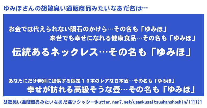 | ヘコむあだ名 | 『ゆみ太郎』『牛乳』『ゆみほ(苦笑)』 |