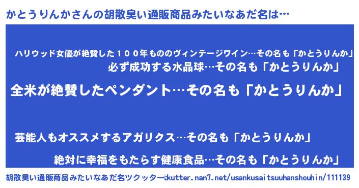 | 男性向けラノベタイトル風あだ名 | 『かとうりんかの嫁は女の子じゃないと思った?』 |