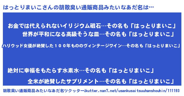 | 男性向けラノベタイトル風あだ名 | 『魔弾の王とはっとりまいこ』 |