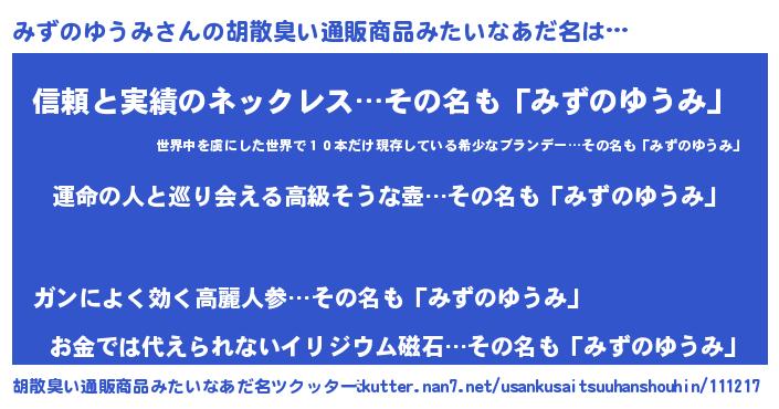 | 男性向けラノベタイトル風あだ名 | 『みずのゆうみ~年齢イコール彼女いない歴の魔法使い~』 |