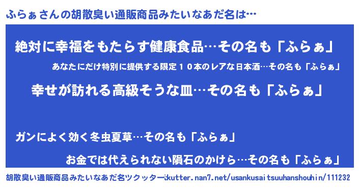 | 意味不明あだ名 | 『ふらぁフォーエバー』『永久保存ふらぁ』 |