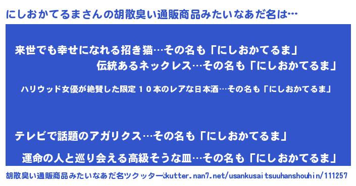 | ヘコむあだ名 | 『にしおかてるま(爆)』『なまこ酢』 |