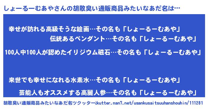 | 欧米人風あだ名 | 『しょーるーむあや・ステッグマイヤー』 |