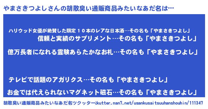 | 男性向けラノベタイトル風あだ名 | 『やまさきつよし~年齢イコール彼女いない歴の魔法使い~』 |