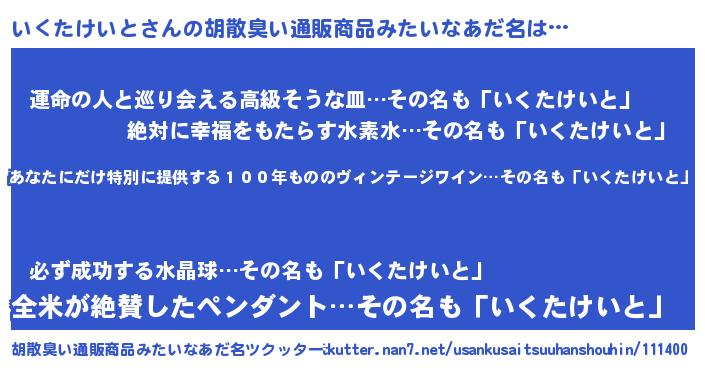 | 男性向けラノベタイトル風あだ名 | 『いくたけいと~年齢イコール彼女いない歴の魔法使い~』 |
