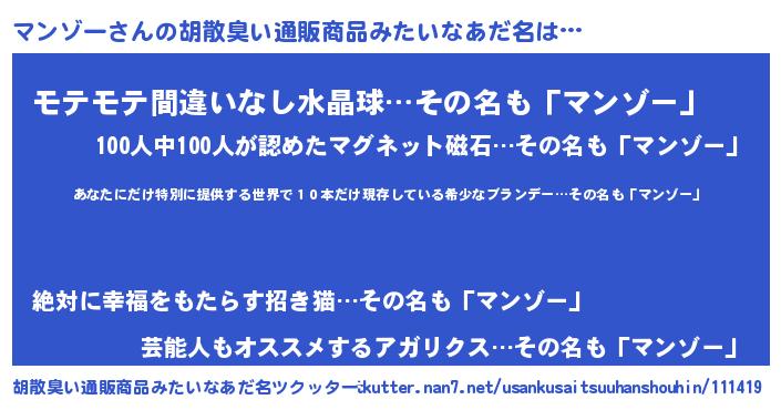 | ヘコむあだ名 | 『マンっふぃ~』『マンゾー(爆)』 |
