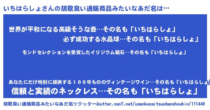 | 男性向けラノベタイトル風あだ名 | 『ノーゲーム・ノーイチハラショ』 |