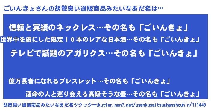| 男性向けラノベタイトル風あだ名 | 『ごいんきょに滅ぼされるだけの簡単なお仕事です』 |
