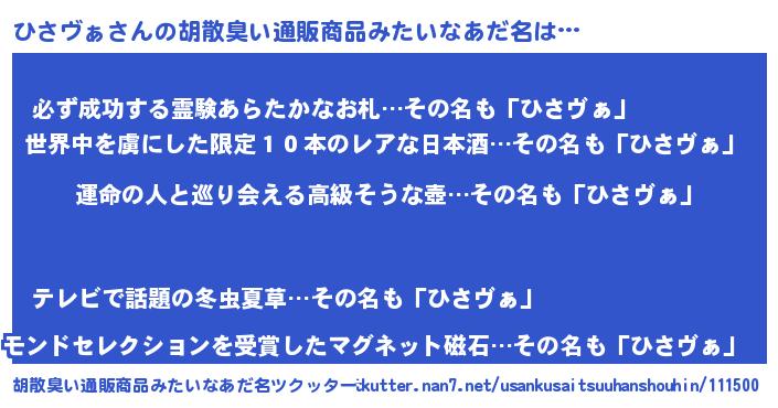 | 男性向けラノベタイトル風あだ名 | 『ひさヴぁ~年齢イコール彼女いない歴の魔法使い~』 |