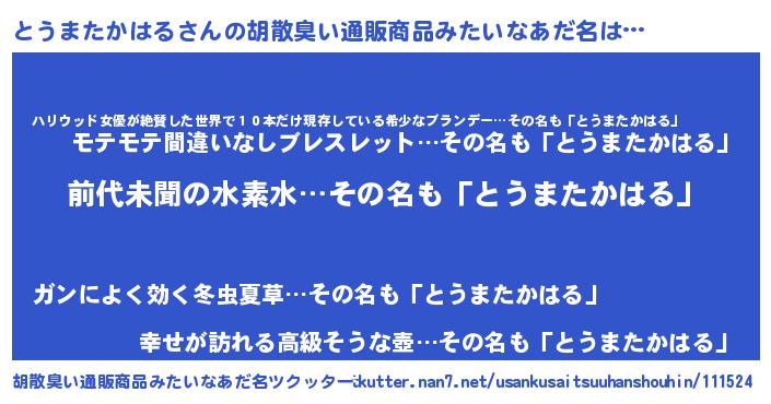 | ヘコむあだ名 | 『とうまたかはる(震え声)』『豆乳』 |
