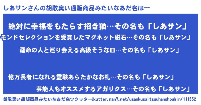 | 男性向けラノベタイトル風あだ名 | 『うちのしあサンが世界を掌握している!』 |