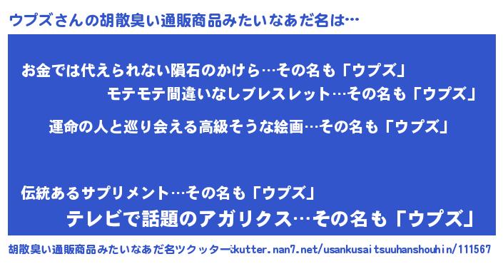 | 男性向けラノベタイトル風あだ名 | 『ウプズに滅ぼされるだけの簡単なお仕事です』 |