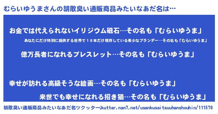 | 恥ずかしいあだ名 | 『プリティーむらいゆうま』『むらちん』 |