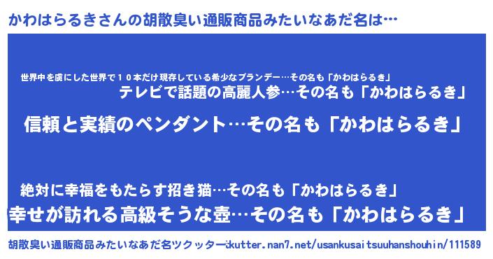 | 意味不明あだ名 | 『とにかく怪しいかわはらるき』 |