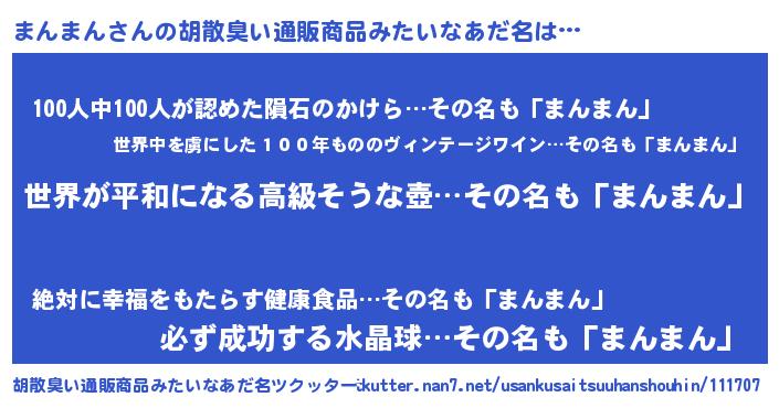 | ヘコむあだ名 | 『なまこ酢』『まんもー』『まん太郎』 |